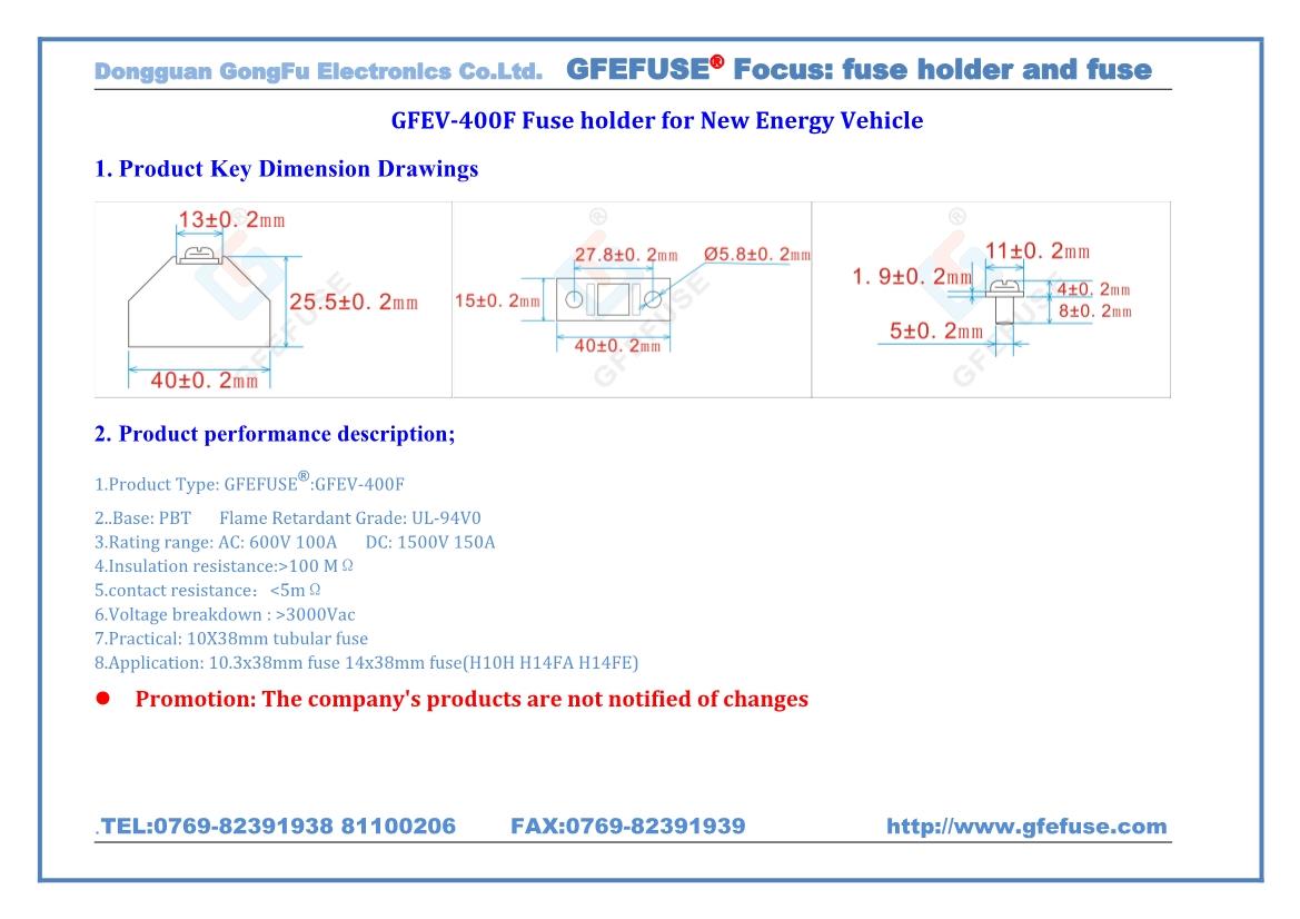 1. Product Type: GFEFUSE:GFEV(400F) 2. Base: PBT 3. Flame Retardant Grade: UL-94V0 4. Rating range: AC: 600V 150A DC: 1500V 150A 5. Insulation resistance:>100 MΩ 6. contact resistance :<5m Ω 7. Voltage breakdown : >3000Vac 8.Practical: 10X38mm tubular fuse